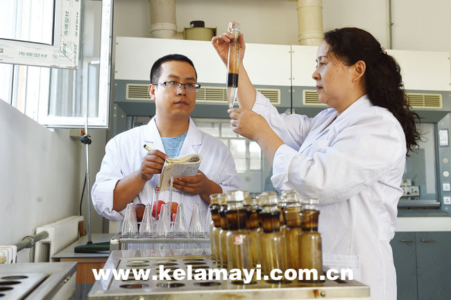 新科澳助劑事業(yè)部技術(shù)人員在進(jìn)行原油脫水實(shí)驗(yàn)。